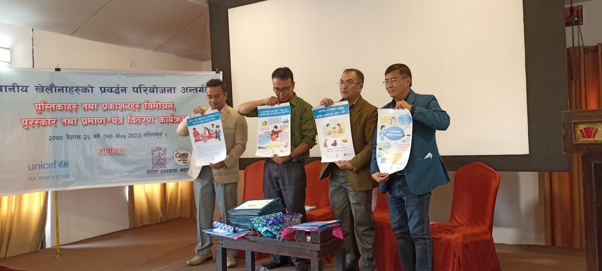 युनिसेफ नेपाल र नेपाल हस्तकला महासंघको संयुक्त आयोजनामा स्थानीय शैक्षिक खेलौना प्रवद्र्धन, विकास तथा स्थानीय उत्पादकको पहिचान गर्ने उद्देश्यबाट आयोजीत स्थानीय खेलौनाहरुको प्रवद्र्धन परियोजना अन्तर्गत प्रकाशित नमुना पुस्तिकाहरु, पोष्टर तथा ब्रोसरको विमोचन र सूती धागो, काठ, कपडा र सेरामिक्स ४ विधामा भएको खेलौना डिजाइन प्रतियोगिताको पुरस्कार तथा प्रमाण–पत्र वितरण कार्यक्रम