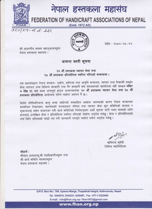 20 Nov २०औं हस्तकला व्यापार मेला तथा १८औं हस्तकला प्रतियोगिता स्थगित गरिएको सम्बन्धमा । २०औं हस्तकला व्यापार मेला तथा १८औं हस्तकला प्रतियोगिता स्थगित गरिएको सम्बन्धमा ।